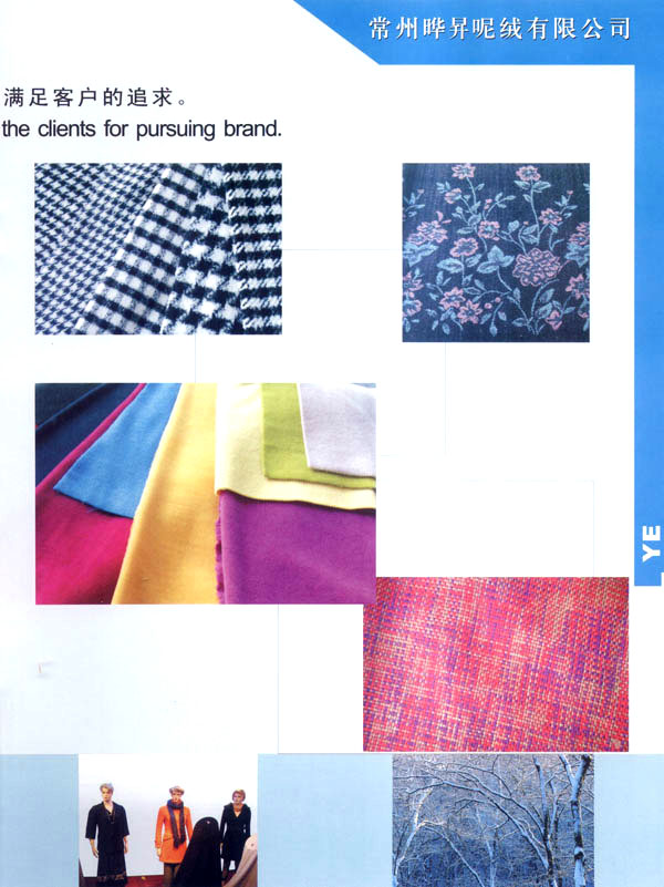 我廠成立于1999年,占地面積占60000平方米。固定資產(chǎn)有6000萬元。年銷售額達到1億元,全廠職工有600余人,技術(shù)員工超過80人,我廠主要經(jīng)營以粗毛紡為主的各式面料,以外銷為主,有一條完整的流水生產(chǎn)線,從原料一染色一紡紗一織造一后整理。我廠擁有12個染缸,日產(chǎn)量為6噸,精紡3600錠,粗紡8個臺套,劍桿織機60臺,后整理有全套精粗紡加工設(shè)備。主要產(chǎn)品有:羊絨,粗花呢,免羊毛,雙面呢,法蘭絨,精紡花呢,維羅呢,阿爾巴卡等,以及各類格子花呢。近年來本企業(yè)利用地區(qū)優(yōu)勢勢力開發(fā)新品,在原有的基礎(chǔ)上開發(fā)出各種備受親睞的花式呢料。如格子花呢,緞染花呢,粗毛絨呢,提花呢,并于2000年通過ISO9002認證。本廠產(chǎn)品主要銷往歐洲,日本,韓國,法國,加拿大,美國,歡迎廣大客戶前來垂詢合作。本廠有志與世界的品牌建立良好的合作關(guān)系。
