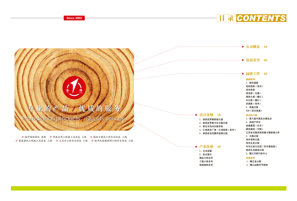 公司以園林綠化工程、市政公用工程、古建筑施工及景觀設(shè)計為主要業(yè)務的綜合性公司。并具備園林綠化一級、市政公用二級、鋼結(jié)構(gòu)三級、古建筑三級、房屋建筑工程施工總承包三級和城市及道路照明工程專業(yè)承包三級資質(zhì)企業(yè)。公司組織機構(gòu)健全、管理制度完善,具備獨特的經(jīng)營理念和服務精神。公司技術(shù)力量雄厚,機械設(shè)備齊全。公司已取得AAA級資信等級、重合同守信用企業(yè),通過ISO9001國際認證體系并取得證書。目前我公司自主培育苗圃1000余畝,常年生產(chǎn)各種常綠、落葉喬木,花灌木、各類盆景、草坪、地被等植物百余種,年產(chǎn)各類苗木250萬株,盆花130萬盆,暢銷省內(nèi)外各地。