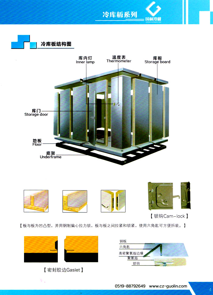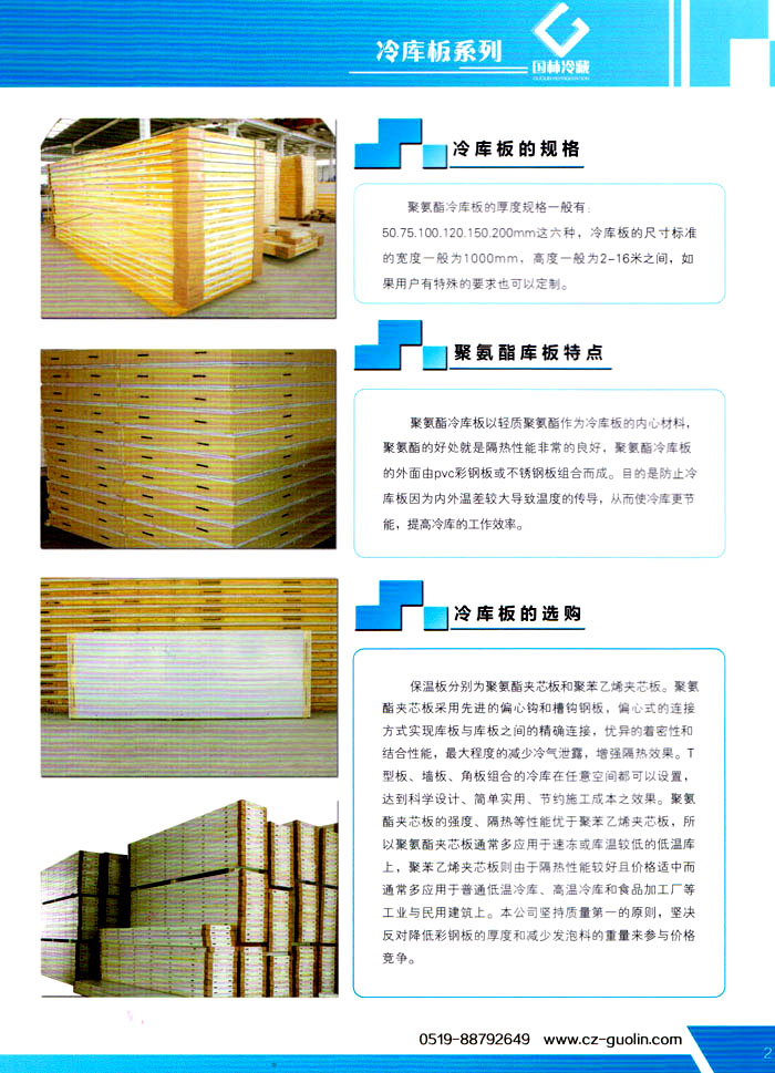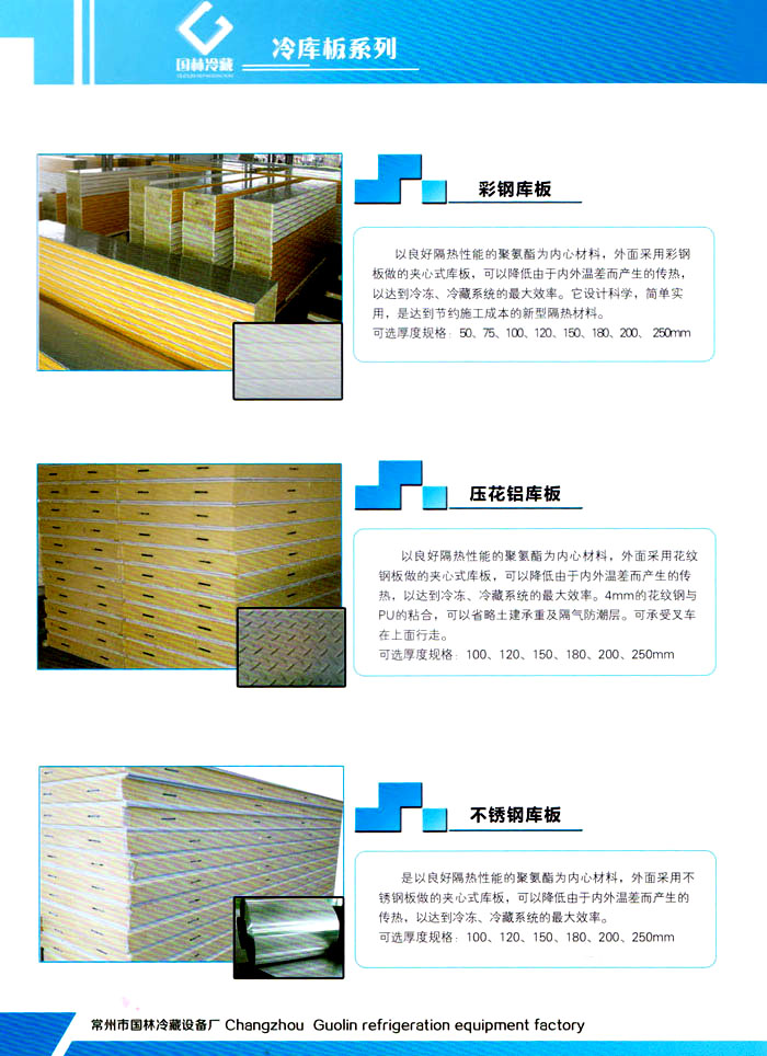 常州市國林冷藏設(shè)備廠(原武進(jìn)長虹冷藏設(shè)備廠)成立于1995年,地處江南水鄉(xiāng)中國富饒的“長江三角洲”中心區(qū)域—江蘇常州,滬寧高速、沿江高速、312國道,交通快捷,即刻到達(dá)。 國林冷庫:公司通過了ISO9001:2000質(zhì)量體系認(rèn)證,國林冷庫多次獲得“江蘇省優(yōu)質(zhì)產(chǎn)品”稱號,全國質(zhì)量服務(wù)AAAAA示范單位,并且是中國食品網(wǎng)、阿里巴巴,空調(diào)制冷誠信通會員企業(yè),并與全國多家設(shè)計院技術(shù)合作,本廠的誠信服務(wù)獲得了廣大客戶的認(rèn)可。 國林冷庫:中國制冷行業(yè)的十大冷庫制造商之一,中國制冷重要工業(yè)生產(chǎn)基地。本公司***生產(chǎn)保溫庫板及冷庫制冷成套設(shè)備,庫板材料涉及不銹鋼、彩鋼板、玻璃鋼板、保溫聚氨脂板。年產(chǎn)量3000多臺,庫板30多萬平方,歡迎新好客戶前來訂購。 國林制冷:公司始終堅持:“質(zhì)量為上,追求品質(zhì)”的生產(chǎn)方針;始終信奉:“客戶為先,服務(wù)為本”的經(jīng)營理念。我們愿同廣大的新老客戶在新的世紀(jì)里,共同發(fā)展,利益雙贏,再創(chuàng)輝煌。 常州市國林冷藏設(shè)備廠***生產(chǎn)7.5公分,10公分,12公分,15公分,20公分的聚氨酯冷庫板,面板包括彩鋼板、不銹鋼板、壓花鋁板等各種板材,各種冷庫半埋門及平移動門,各種鐵排管和鋁排管,價格優(yōu)惠,有需要的可以聯(lián)系我金文燁18761183807