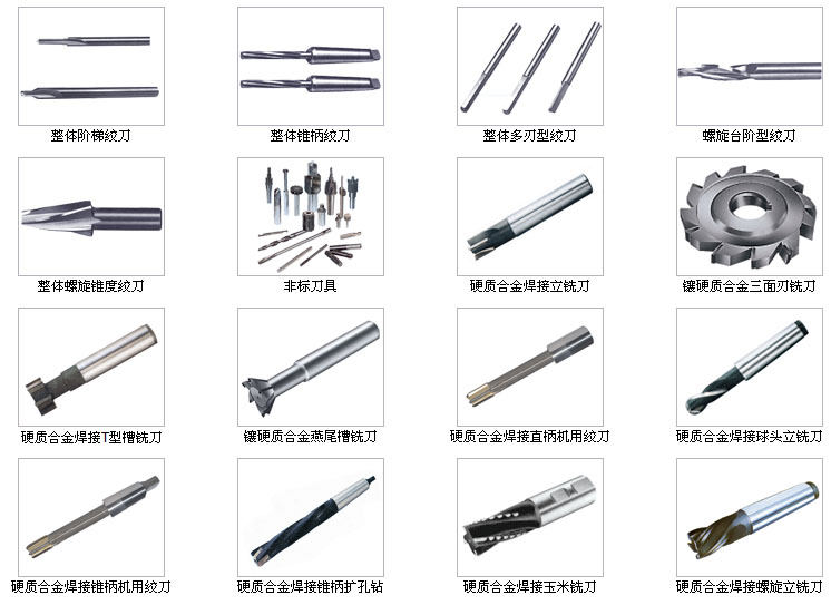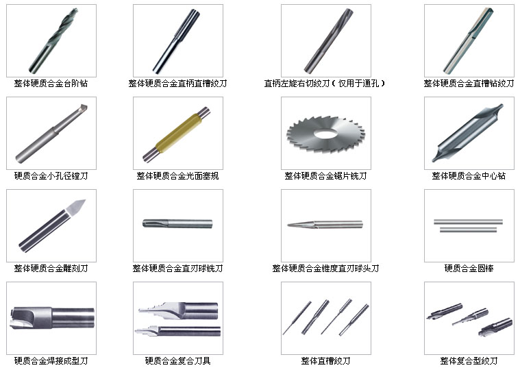 1 整體硬質(zhì)合金柄麻花鉆 2 粗柄麻花鉆 3 直柄鍵槽銑刀 4 力銑刀 5 球頭銑刀 6 鉸刀 7 鏜刀 8 定柄鉆 9 精磨元棒 10 光面塞規(guī) 11 精磨銑刀 12 鑲合金螺旋立銑刀 13 鑲合金鉸刀