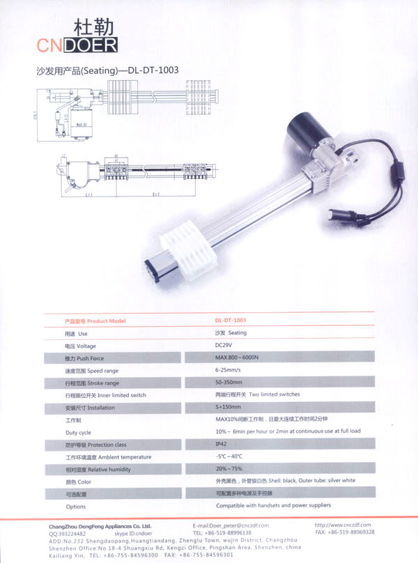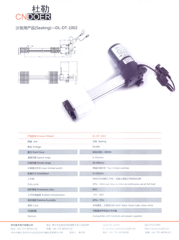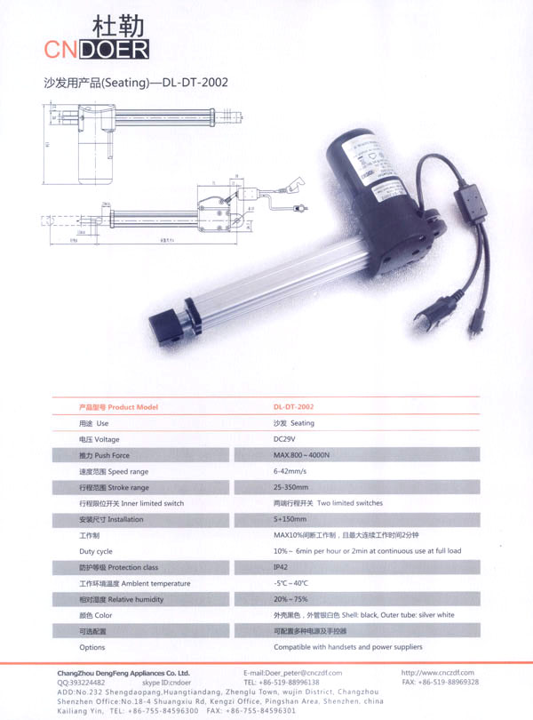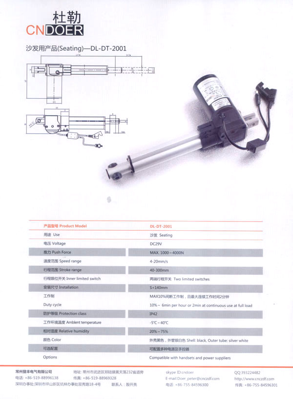如今,公司為謀求新的發(fā)展,立足于國(guó)內(nèi),放眼于國(guó)際市場(chǎng),投入了大量的人力、財(cái)力、物力,購(gòu)置了先進(jìn)的全自動(dòng)生產(chǎn)流水線、全自動(dòng)繞線機(jī)和各類精密的測(cè)試儀器,多功能隔音房等設(shè)施,全新推出了具有美好前景和廣闊市場(chǎng)的主打產(chǎn)品:“杜勒”牌系列線性推桿及各類配套電機(jī)。該產(chǎn)品已通過(guò)ISO9001認(rèn)證,產(chǎn)品外觀新穎、制作精良、噪音小、操作靈活簡(jiǎn)便,暢銷國(guó)內(nèi),遠(yuǎn)銷國(guó)外,被廣泛應(yīng)用于電動(dòng)沙發(fā)、醫(yī)療護(hù)理床、手術(shù)床、按摩椅等眾多領(lǐng)域!岸爬铡碑a(chǎn)品已被越來(lái)越多的客戶所青睞和認(rèn)可!