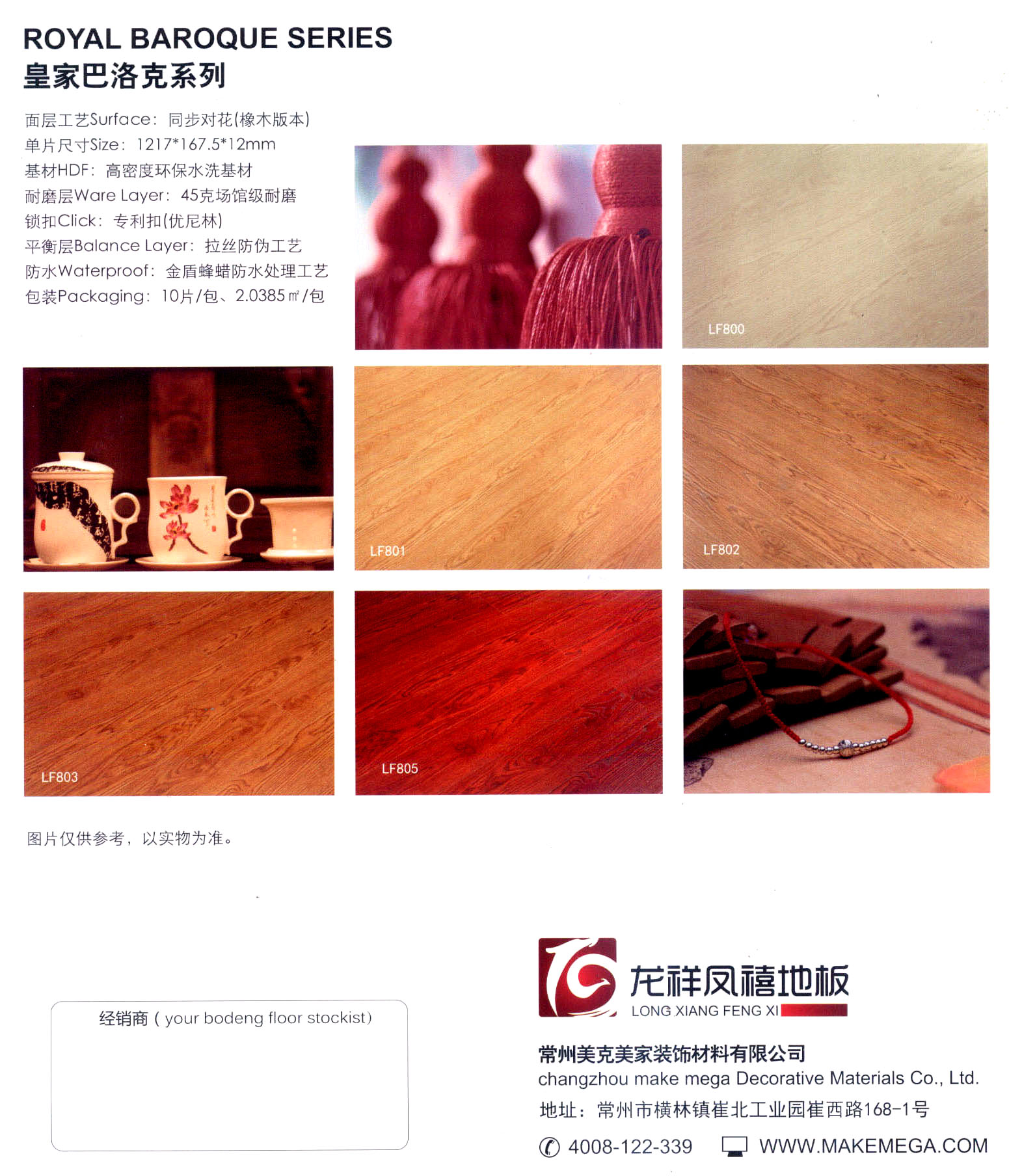 常州美克美家裝飾材料有限公司是專業(yè)制造和銷售中高端地板的知名企業(yè),也是中國強(qiáng)化木地板之都龍頭企業(yè)之一。位于我國長三角城市經(jīng)濟(jì)最發(fā)達(dá)地區(qū)常州市。公司持有商標(biāo) “龍祥鳳禧®” , “曼寧頓®”和“MAKEMEGA”® 三大品牌。 公司擁有國內(nèi)外高科技地板生產(chǎn)技術(shù), 2011年投入了800萬元進(jìn)行技術(shù)改造,引進(jìn)代表世界最高先進(jìn)水平的德國威力(WEINIG)四面刨開槽生產(chǎn)線及德國藍(lán)幟(LEITZ)金剛石刀具,并攜手夏特.IP.大亞.羅賓等國際知名公司。年產(chǎn)量將達(dá)到600萬平方米。產(chǎn)品有意大利高級名師設(shè)計(jì), 分為簡約中國式風(fēng)格,現(xiàn)代風(fēng)格,簡歐風(fēng)格,復(fù)古風(fēng)格等系列,從而確保了地板的款式新穎,質(zhì)量過硬,健康又環(huán)保。公司現(xiàn)已通過ISO9001質(zhì)量管理體系認(rèn)證,ISO14001環(huán)境管理體系認(rèn)證等多部門的認(rèn)可和獲獎。目前產(chǎn)品已銷售到全國各大建材超市等多家大型連鎖店,并為國內(nèi)某幾家著名地板品牌承擔(dān)OEM(貼牌加工)。公司已在全國設(shè)立幾十家專賣店,已有20多萬㎡的大型工程經(jīng)驗(yàn), 例如:中國海軍療養(yǎng)院, 上海復(fù)旦大學(xué)科研樓, 浙江電視臺(部分), 深圳龍崗體育中心,北京國家汽車質(zhì)量監(jiān)督檢驗(yàn)中心大樓,等大型工程。 常州美克美家裝飾材料有限公司掌握世界領(lǐng)先科技, 立足中國, 傲視亞洲, 面向全球, 在公司董事長的戰(zhàn)略指導(dǎo)下,實(shí)施品牌戰(zhàn)略,全球化戰(zhàn)略。 常州美克美家裝飾材料有限公司時刻挑戰(zhàn)自我,挑戰(zhàn)未來,為創(chuàng)造出美譽(yù)全球的產(chǎn)品,滿意百分百的服務(wù),樹立高端品牌形象,全力打造地板第一奢侈品牌。