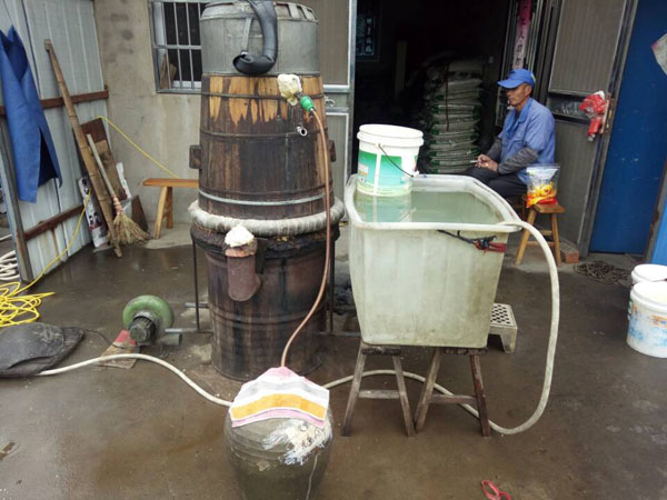 第四步:放入缸中,酒曲和糯米拌好后,便可放入屋內(nèi)的大缸中,并在其中挖出個(gè)圓形的洞,放入竹筒做酒窩。在此之前,大缸可用之前冷卻糯米飯的溫水擦一擦暖缸,這樣更有益于酒曲發(fā)酵。為了保證酒曲發(fā)酵的溫度,還要給酒料附上塑料薄膜。若是氣溫低于零度,還得多蓋上幾層棉被才行。像池阿姨家的400斤糯米,老徐至少要重復(fù)這些步驟八遍!大缸中的酒料大約發(fā)酵了10天左右,在酒乳已非常豐富之際,按照1:1的比例,打開(kāi)封口加入冷開(kāi)水,然后再蓋上棉被。繼續(xù)放置45天后,米酒才算大功告成!如果覺(jué)得米酒不過(guò)癮,老徐還會(huì)將米酒吊成燒酒,也就是白酒,依舊是傳統(tǒng)的老手藝。未來(lái)某天,TA會(huì)消失 ,其實(shí),做米酒的方法并不難,幾乎是以前家家戶戶的必備技能。然而現(xiàn)如今,不僅老常州們不再自己做酒,就連像老徐這樣的做米酒手藝人也越來(lái)越少。就連跟了老徐三十多年的一套米酒家當(dāng),也同樣經(jīng)不起歲月:鐵鍋漏了要去找橫山橋的老師傅;木桶壞了要去禮嘉修;爐子也有專(zhuān)門(mén)的式樣,過(guò)幾年就要拿著圖紙找人翻新......