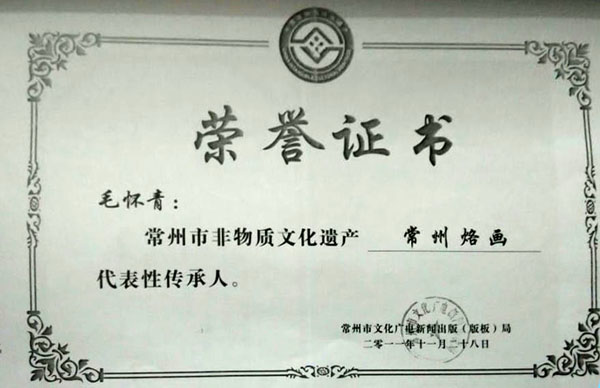 毛懷青,江蘇常州市武進(jìn)人。 中國(guó)工藝美術(shù)學(xué)會(huì)會(huì)員,常州市中國(guó)烙畫(huà)研究會(huì)副會(huì)長(zhǎng),常州市文博鑒賞協(xié)會(huì)理事,非物質(zhì)文化遺產(chǎn)烙畫(huà)傳承人。高級(jí)工藝美術(shù)師。 年輕時(shí)學(xué)習(xí)國(guó)畫(huà)、油畫(huà)中年蔓現(xiàn)掌州咯畫(huà)源遠(yuǎn)流長(zhǎng)、歷史悠久,有著其它美術(shù)門(mén)類(lèi)不具備的藝術(shù)風(fēng)格與特色?芍^是工藝美術(shù)中的一朵十分亮麗的藝術(shù)奇葩,是我民族先人給我們留下的一份不可多得十分珍貴的一份文化遺產(chǎn)。為弘揚(yáng)與發(fā)展這份優(yōu)秀文化遺產(chǎn),我從此下定決心研究烙畫(huà),愿付出一份力量為振興烙畫(huà)事業(yè)做出貢獻(xiàn)。至今已潛心研究幾十年,取得了可喜的成績(jī),被業(yè)界公認(rèn),社會(huì)關(guān)注與認(rèn)可。有“江南烙畫(huà)第一筆”之美譽(yù)。 近年來(lái),創(chuàng)作的烙畫(huà)作品分別獲得過(guò)全國(guó)、省市級(jí)的金、銀、銅獎(jiǎng)多次。中央電視臺(tái)曾兩次播放過(guò)本人的烙畫(huà)作品,江蘇電視臺(tái)、常州電視臺(tái)也曾多次播放過(guò)本人的作品與烙畫(huà)藝術(shù)生涯,揚(yáng)子晚報(bào)、常州日?qǐng)?bào)、常州晚報(bào)也曾多次報(bào)導(dǎo)過(guò)本人的烙畫(huà)作品,出版物有三種版本都能查閱到介紹本的烙畫(huà)從藝生涯與藝術(shù)業(yè)績(jī)。