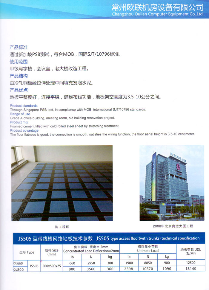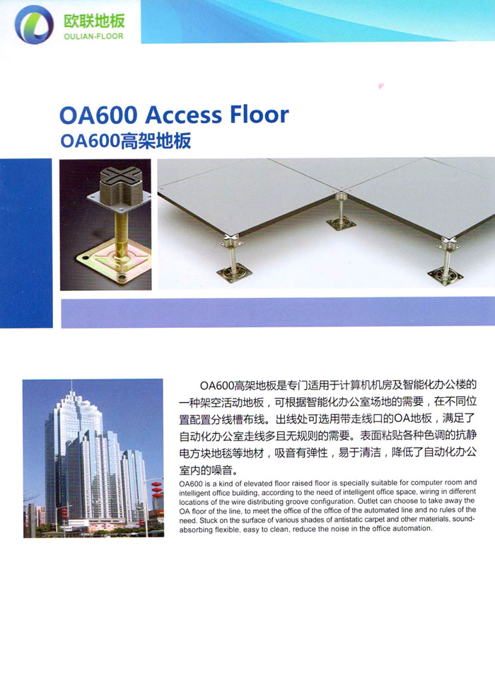 防靜電高架活動地板、全鋼地板、陶瓷地板是計(jì)算機(jī)行業(yè)發(fā)展起來的新型鋪地材料,隔離了潮氣、靜電灰塵,最重要的是解決了綜合布線問題,無需預(yù)埋管線,可隨時(shí)拆卸、搬移,保證了資訊設(shè)備完整的優(yōu)點(diǎn),適應(yīng)了智能化樓宇中信息自動化技術(shù)對所處環(huán)境的特定要求,避免了廣大客戶的雙重投資,使現(xiàn)代化辦公程度更加高效,辦公場所更加舒適。 “歐聯(lián)”系列全鋼地板,符合國家安全要求,種類完備多樣,其中防靜電陶瓷地板、硫酸鈣地板等除具有普通瓷質(zhì)的裝飾和實(shí)用性外,其耐磨、防水、防火功能優(yōu)于其它同類產(chǎn)品,防靜電系列地板,能切合不同客戶的要求,其靈活的配置,深受客戶歡迎,不同材質(zhì)的地板結(jié)構(gòu)使設(shè)計(jì)師的設(shè)計(jì)空間比傳統(tǒng)的更加廣闊自由和善變。 公司大力發(fā)展國內(nèi)外銷售業(yè)務(wù),多次中標(biāo)國內(nèi)重點(diǎn)工程 ,例:哈爾濱醫(yī)科大學(xué)、山東大學(xué)、上海普通機(jī)場等。 公司將一如既往開發(fā)和制造一流的產(chǎn)品,愿與廣大有識之士合作發(fā)展,共創(chuàng)美好未來。