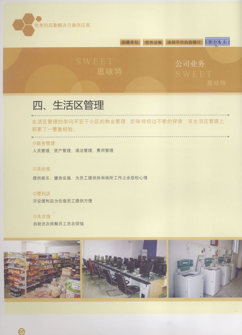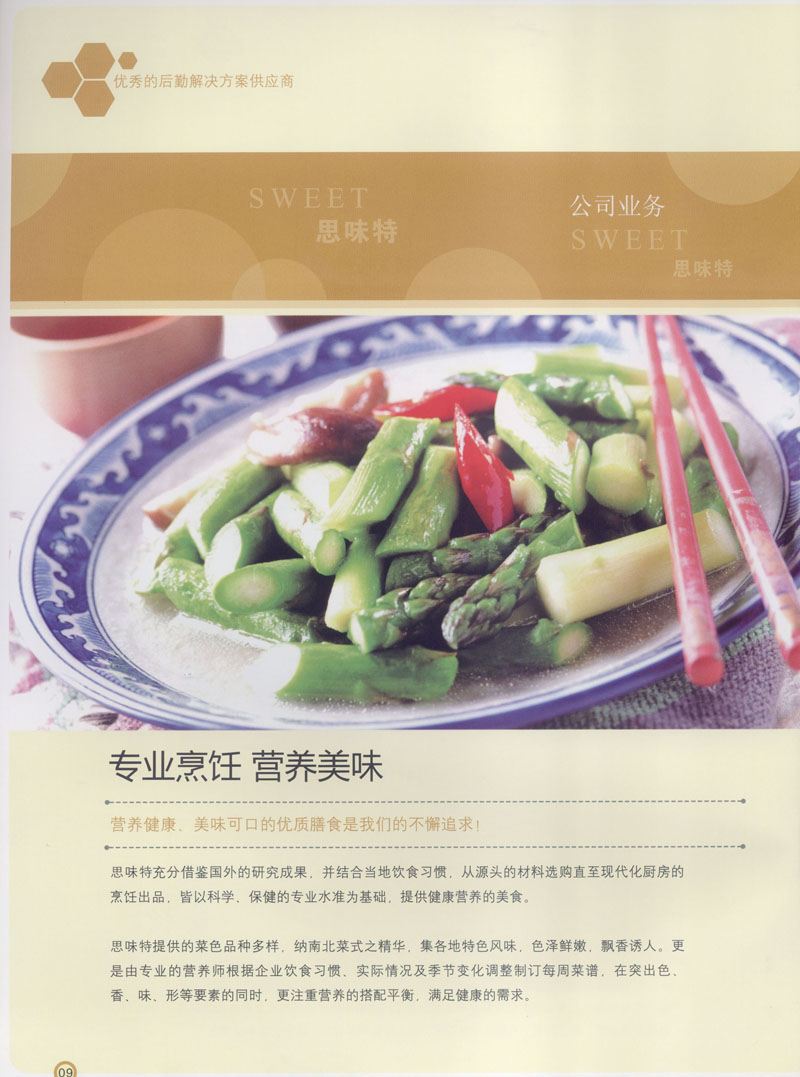 常州市思味特餐飲有限公司是一家專業(yè)從事企事業(yè)后勤服務(wù)的有限責任公司,公司從承包食堂起步,逐漸發(fā)展為經(jīng)營團膳承包、營養(yǎng)送餐、生活區(qū)管理、連鎖餐廳的綜合型企業(yè)。2008年公司斥資100萬元,在常州興建了可以同時提供3000餐膳食的中央廚房,重點打造“和美客”后勤服務(wù)品牌,全力為企事業(yè)單位解決后勤后顧之憂。 到目前為止,我們合作成功的企事業(yè)單位超過50多家,服務(wù)人數(shù)突破15萬,合作單位包括國家機關(guān)、國有企業(yè)、三資企業(yè)、民營企業(yè)、學校、醫(yī)院等,其中不乏國際知名品牌公司。 和美客愿為更多的國內(nèi)外企事業(yè)單位及機關(guān)團體分憂解難,從廚房設(shè)計、菜品配送、團膳承包、到生活區(qū)管理等提供全方位的服務(wù)。